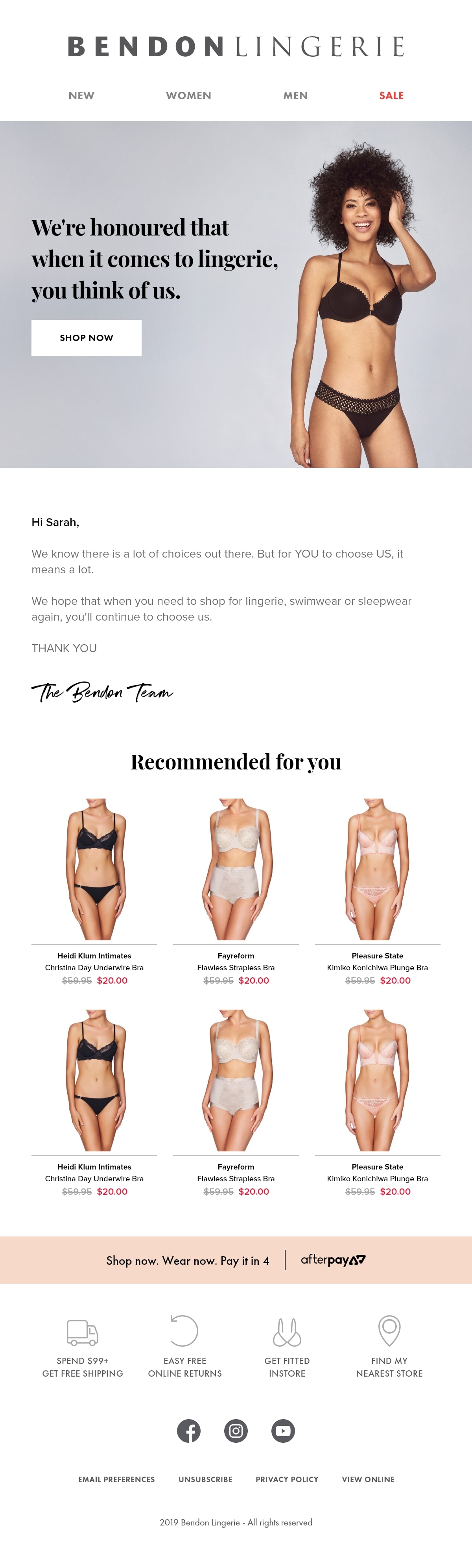 Founded in 1947, Bendon is a global leader in intimate apparel, swim+resort and sleep. The company revolutionized the lingerie industry through its dedication to quality and innovation, creating a design philosophy that has grown stronger throughout the company's history. Bendons brands include Naked, Frederick’s of Hollywood, Heidi Klum Man, Heidi Klum Intimates, Heidi Klum Solutions, Fayreform, Pleasure State, Lovable, Bendon, Bendon Man, Hickory, and Davenport.